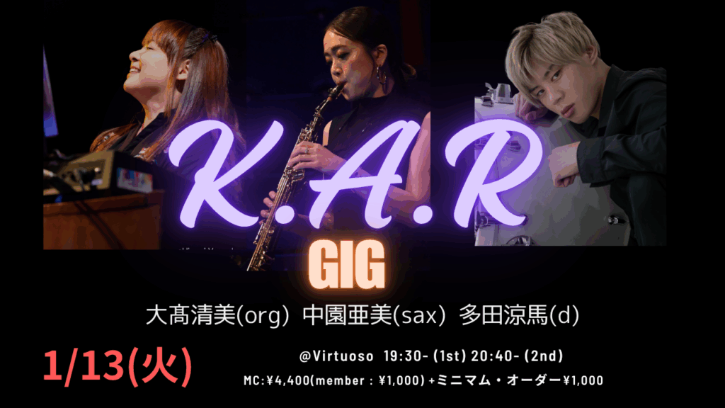 1/13(火) K・A・R GIG 大高清美(org)中園亜美(sax)多田涼馬(d)