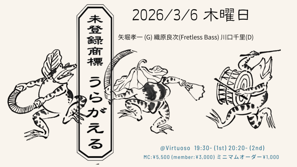3/6(金)うらがえる 矢堀孝一(g) 織原良次(fretless bass) 川口千里(d)